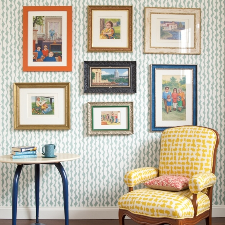 Using patterned frames can add a playful yet intentional touch to your gallery wall. By keeping the artwork within a similar theme while varying frame designs, you create a cohesive yet dynamic display. This approach works especially well against patterned wallpaper, adding layers of visual interest without clashing.
