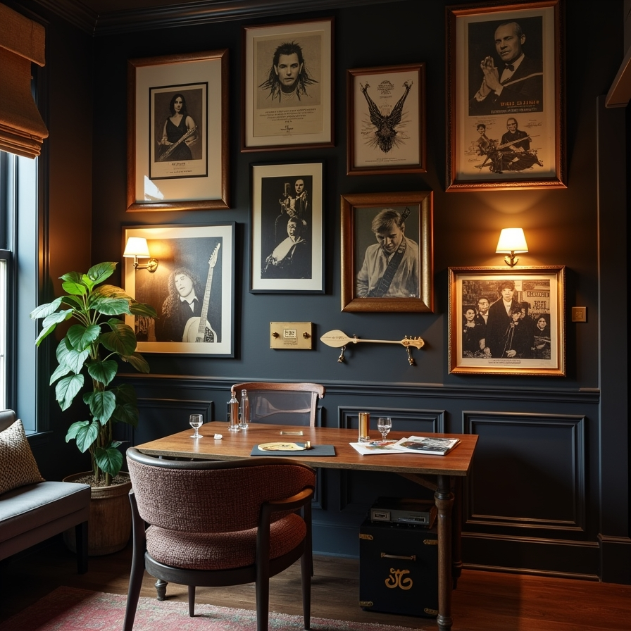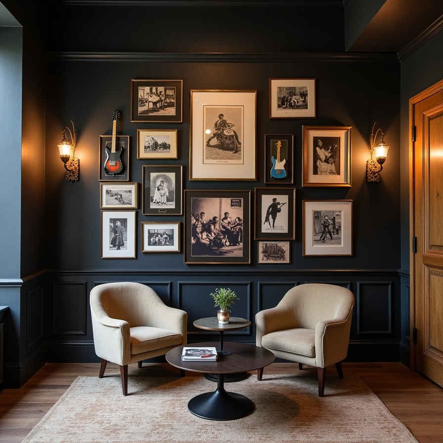A music-themed gallery wall is perfect for creating a dedicated creative or entertainment space. Dark walls can provide a warm and dramatic backdrop for artwork related to music, such as prints, instruments, or memorabilia. Adding lighting elements like wall sconces enhances the display and highlights key pieces. This type of gallery wall reflects passion and personality, making the room feel both stylish and meaningful.