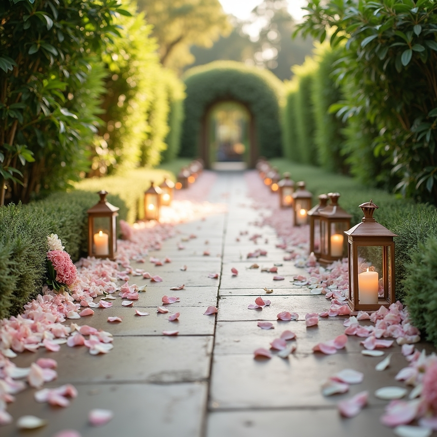 Many couples prefer biodegradable petals or dried flowers, which are environmentally friendly and visually appealing. Adding lanterns or small floral clusters along the edges helps guide the eye toward the ceremony space. When combined with greenery and natural light, this setup creates a soft, storybook-like entrance that feels both romantic and memorable.
