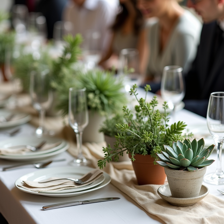 Guests often enjoy taking these plants home as keepsakes, making them both decorative and meaningful. Paired with soft linens and simple tableware, the greenery creates a relaxed and welcoming atmosphere. This approach keeps the decor natural while adding texture and life to the reception space.