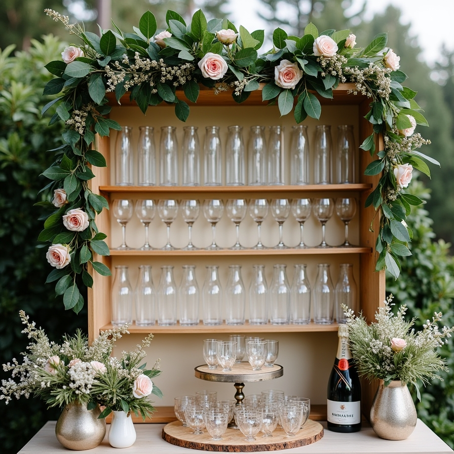 A champagne wall decorated with greenery and flowers can serve as both decor and a functional feature. Glasses arranged neatly on shelves allow guests to easily grab a drink as the celebration begins.