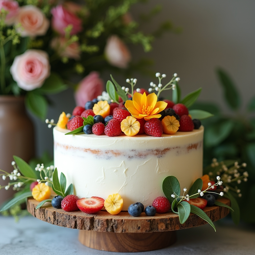 Placing the cake on a wooden stand surrounded by greenery enhances its presentation. The natural colors and textures match the overall theme, making the cake feel like part of the decor. Guests often enjoy desserts that look fresh and taste light, adding to the overall experience.