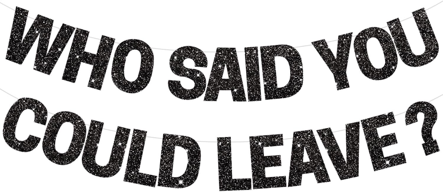 “Who Said You Could Leave” shiny banner set includes 2 pre-strung banners made of high-quality cardstock, durable yet lightweight; no DIY needed, letters stay in place, even at angles; versatile design fits various widths; perfect for farewell, retirement, going-away, or graduation parties; easy to hang on walls, ceilings, tables, or use as a photo backdrop, adding vibrant character.