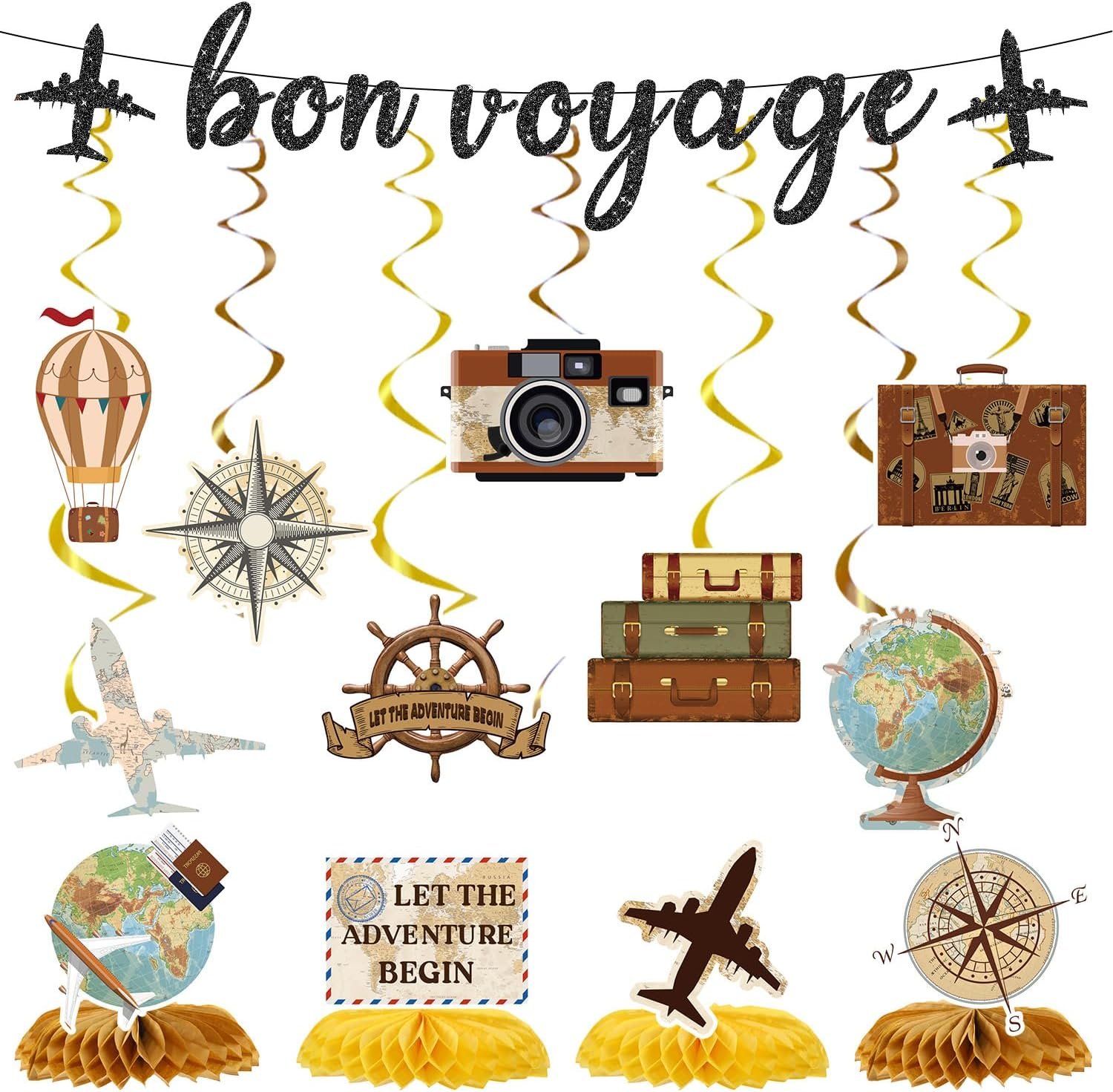 The Bon Voyage party decoration set includes 1 pre-assembled “Bon Voyage” banner, 8 travel-themed hanging swirls, and 4 “Let the Adventure Begin” honeycomb centerpieces. Crafted from high-quality materials, each piece is easy to hang and instantly adds charm to farewell, adventure, going-away, travel, or retirement parties. Perfect for creating a warm, fun, and memorable celebration.