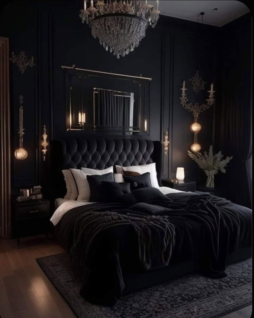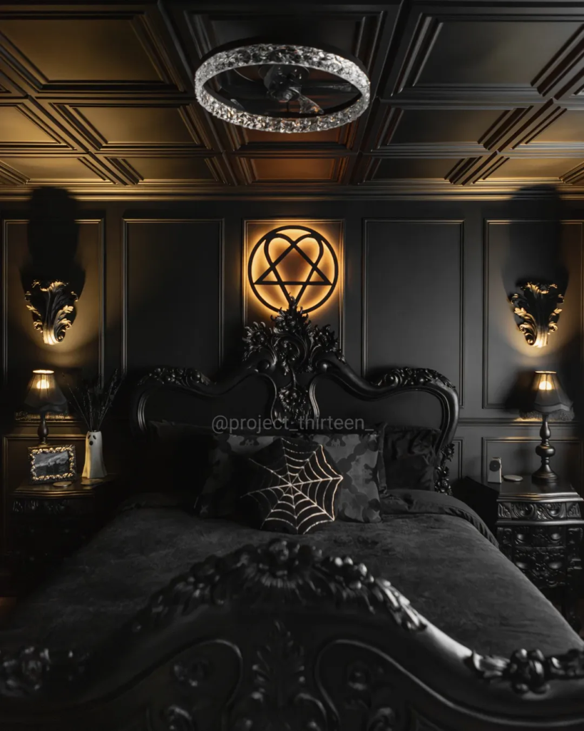 This bedroom embodies gothic glamour in a polished, contemporary way. The carved black bed, paneled walls, and illuminated symbol above the headboard create a luxurious, moody atmosphere reminiscent of a modern castle suite. Ceiling details and crystal lighting elevate the drama without overwhelming the space. What stands out is how intentional it feels: every element is curated rather than cluttered. It proves that gothic décor can be refined and powerful, delivering a dramatic statement while remaining functional and visually cohesive.