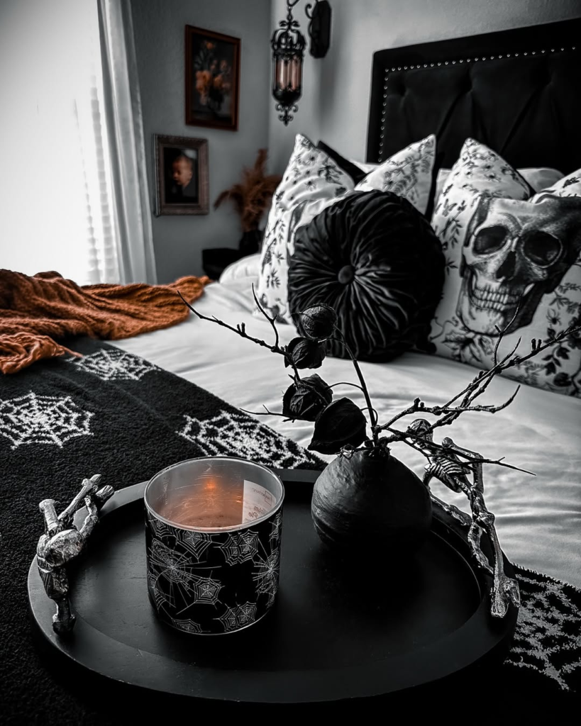 Cozy meets dark in this layered gothic space. Skull pillows, spiderweb accents, and inky blacks are softened with plush textiles and warm lighting, making the room inviting rather than intimidating. Pops of burnt orange break up the monochrome palette and add warmth. The balance between spooky details and comfort allows the space to feel lived-in and approachable. This design demonstrates that gothic style doesn’t need to be stark or overwhelming—it can be both atmospheric and homey, perfect for curling up with a book or relaxing.