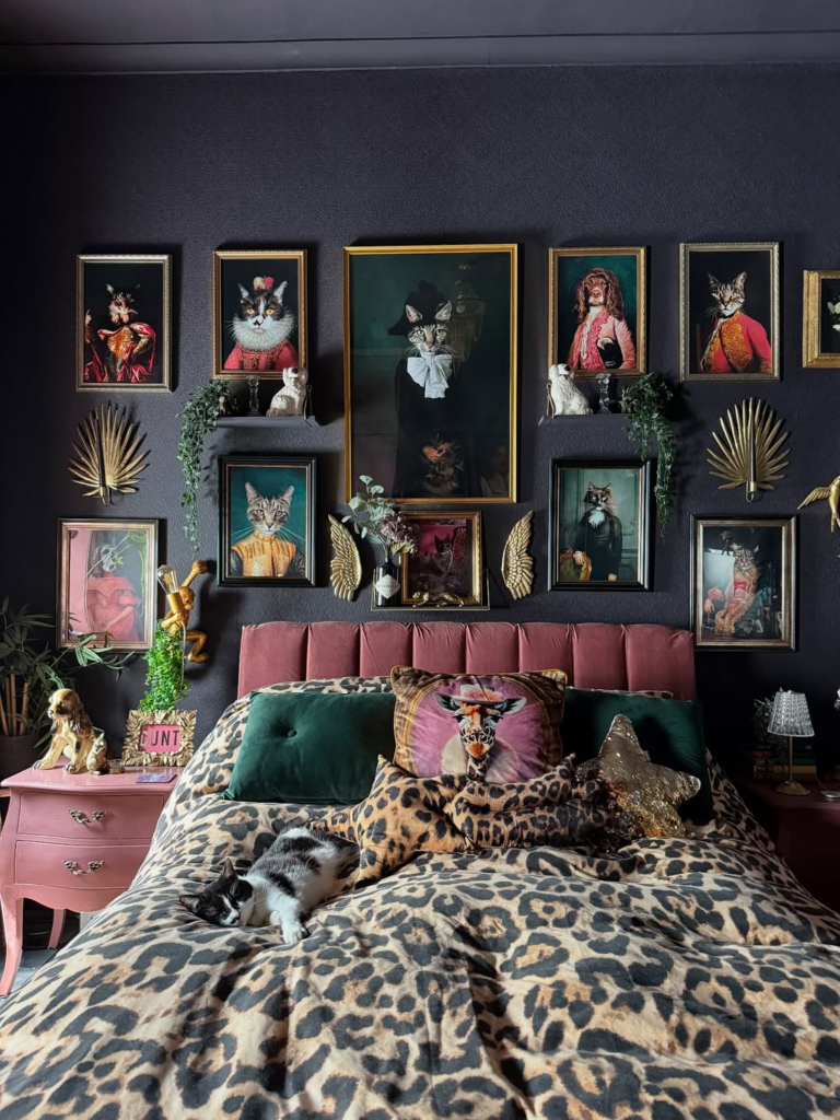 This room is a bold, unapologetic celebration of personality. Leopard-print bedding, jewel-toned walls, and a gallery of feline-inspired art create a theatrical and eclectic atmosphere. The deep charcoal backdrop grounds the dramatic elements, while playful details like a pink nightstand soften the intensity. Every piece contributes to a cohesive yet daring aesthetic. The space proves that maximalist gothic décor can coexist with whimsy and charm. It’s a fearless bedroom where dramatic style meets personal expression, ideal for anyone who loves cats and isn’t afraid to embrace bold design.