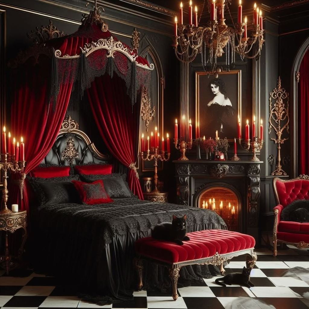 Red velvet drapes, black walls, gold accents, and a canopy bed transform this bedroom into a cinematic, romantic retreat. Checkerboard floors and an ornate fireplace further enhance the theatrical energy, creating a space that feels more like a stage set than a bedroom. Candlelight adds warmth, softening the dramatic palette and making it intimate. The design demonstrates how gothic aesthetics can be luxurious and romantic without becoming overbearing. It’s perfect for anyone looking to combine classic gothic opulence with personal, dramatic flair.