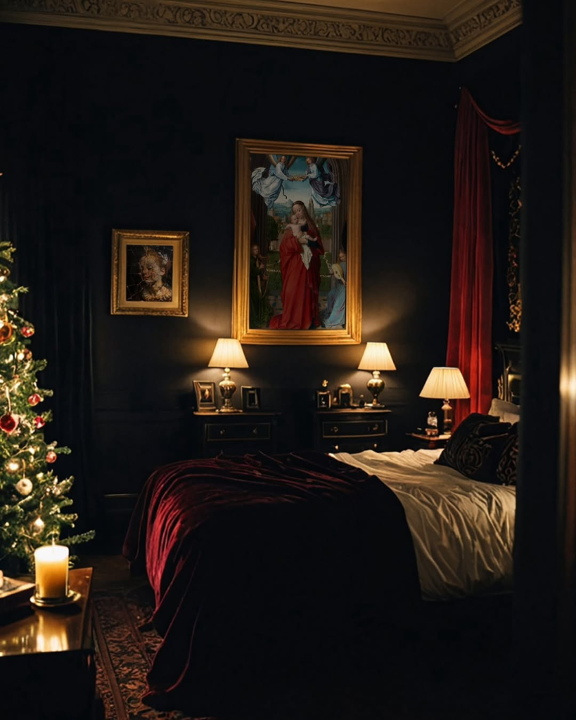 Dark navy walls and classical artwork create a layered gothic backdrop, while warm lighting and subtle holiday décor add a festive touch. A softly lit Christmas tree complements the moody palette, blending seasonal charm with gothic sophistication. Deep reds, gold frames, and glowing lamps provide warmth, ensuring the room feels inviting rather than austere. This space shows that gothic style can be flexible, embracing seasonal elements without losing its moody, refined character. It’s a harmonious mix of drama, intimacy, and subtle celebration.