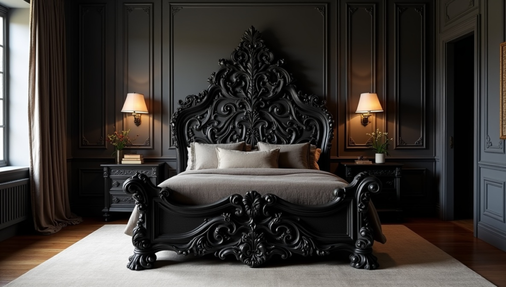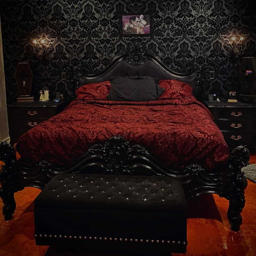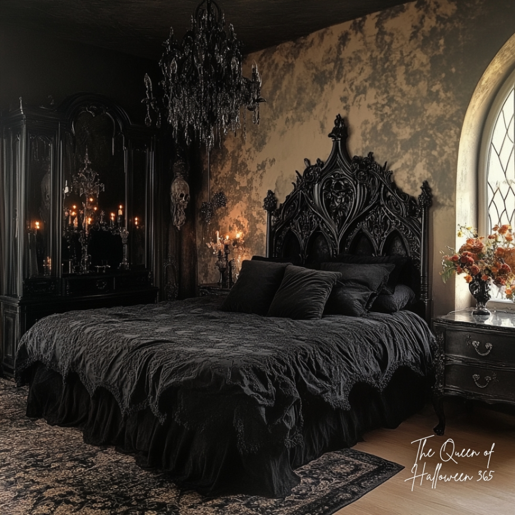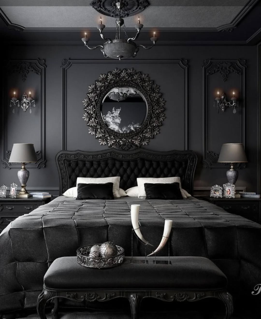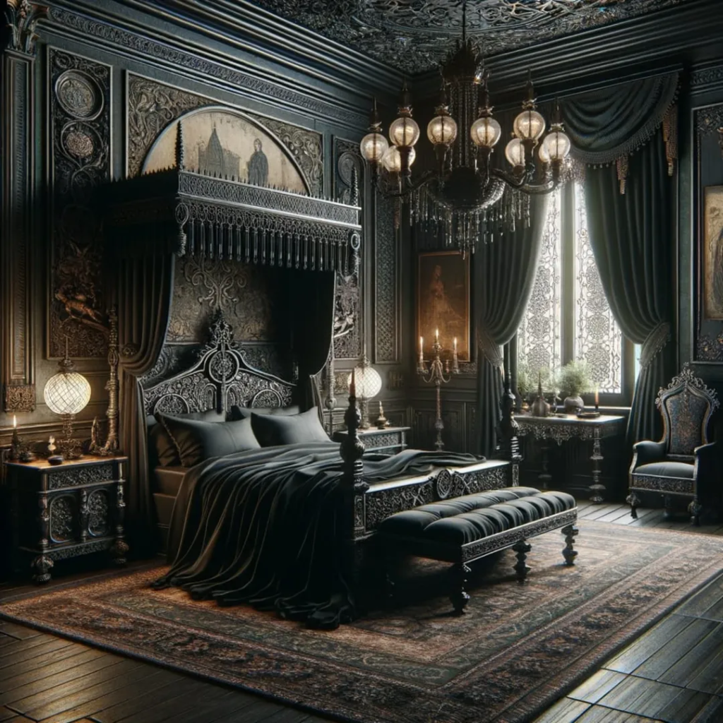 The centerpiece of this room is a dramatic, jet-black carved bed that defines the entire space. Its craftsmanship and scale make additional décor almost unnecessary, allowing the furniture to tell the story. Heavy woodwork, sharp lines, and detailed carving create timeless gothic elegance. This approach emphasizes that quality pieces can anchor a room more effectively than layers of accessories. It proves that gothic design is not only about color or theme—it can be about form, artistry, and bold yet intentional furniture choices that stand the test of time.