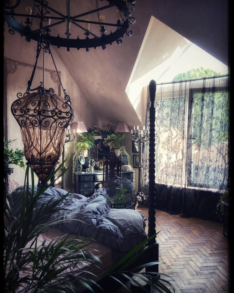 Delicate lace curtains, soft daylight, and oversized lantern pendants create a lighter take on gothic style. The room balances moody accents with freshness through greenery and vintage furnishings. It feels romantic and whimsical while maintaining gothic undertones. The design proves that darker aesthetics can coexist with softness and light, resulting in a space that is atmospheric yet inviting. This approach offers a dreamy, storybook-like bedroom where gothic elegance meets comfort, ideal for those who appreciate subtlety and charm within dramatic interiors.