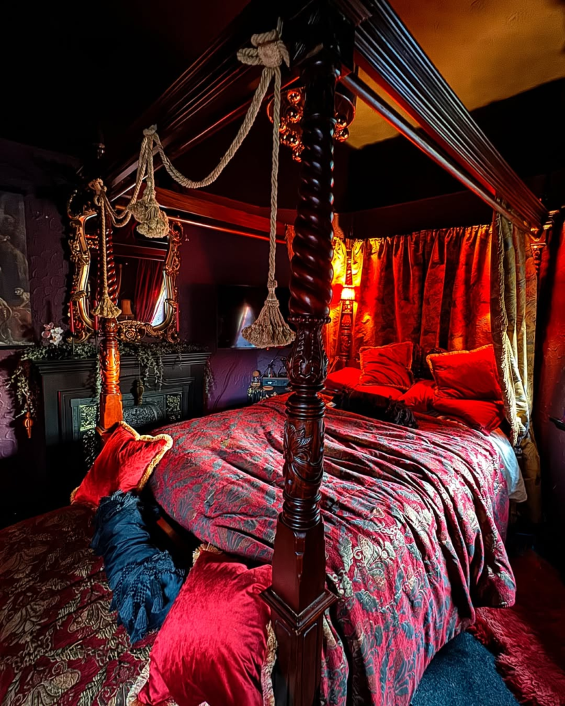 A four-poster bed draped in deep red damask commands attention in this unapologetically gothic bedroom. Plum walls, ornate mirrors, and warm firelight add depth and theatricality. The space evokes romantic, candlelit energy, perfect for a private retreat. Every element contributes to a dramatic narrative, from tassels to layered textures. This room demonstrates that embracing maximalist gothic style can be rewarding when thoughtfully executed. It’s bold, indulgent, and immersive—a space where theatrical charm meets personal expression.
