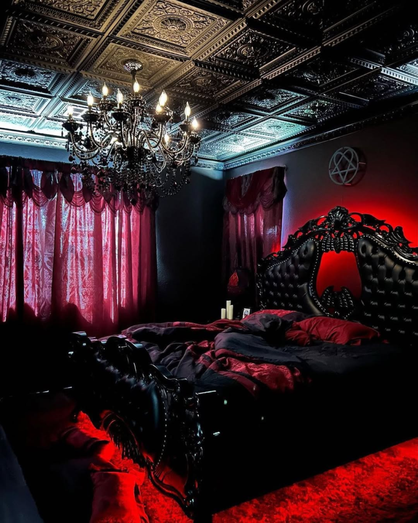 Blood-red lighting under a black tufted bed, paired with coffered ceilings and bold accents, gives this space a dramatic, rebellious vibe. The room feels edgy, theatrical, and unapologetically modern gothic. Lighting is used strategically to enhance atmosphere, while furniture and décor maintain functionality. The result is a daring, immersive bedroom that celebrates color, contrast, and personality. This approach proves gothic interiors don’t need to be subdued to feel elegant—they can be bold, playful, and completely captivating.