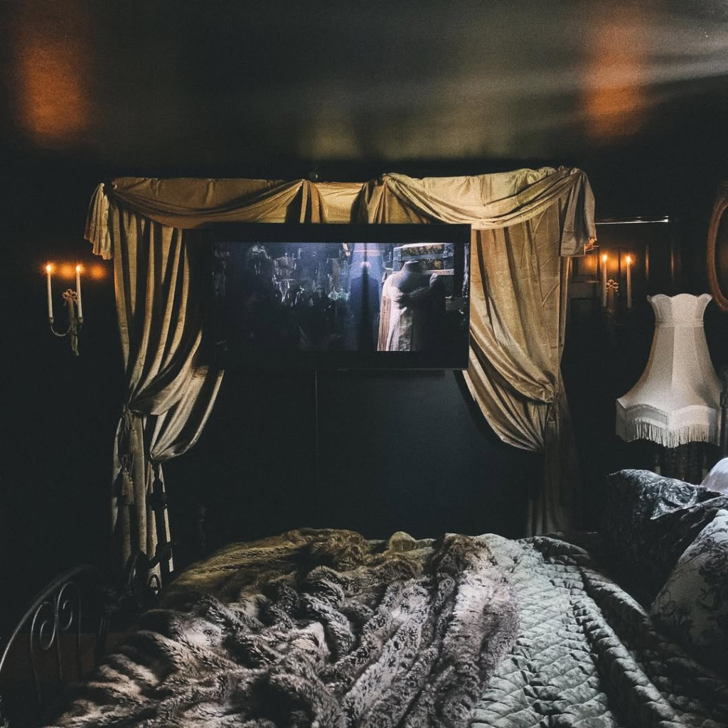 Low lighting, heavy drapes, and textured throws create theatrical ambiance in this gothic bedroom. A wall-mounted TV framed with fabric enhances the cinematic feel, while mood lighting sets the tone for relaxation. The design prioritizes atmosphere over ornamentation, emphasizing comfort, depth, and drama. Cinematic Shadows proves that gothic interiors can feel immersive and stylish without excess. Every element contributes to a cohesive mood, resulting in a bedroom that’s dramatic, intimate, and perfect for unwinding.