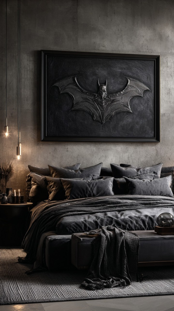 Dark, clean lines and oversized bat artwork define this sleek gothic bedroom. Charcoal bedding and simple furnishings keep the space modern while maintaining dramatic energy. The design demonstrates restraint: a few bold pieces establish character without overcrowding the room. Minimal Bat Cave proves gothic style can be edgy and impactful while remaining functional and livable. It’s ideal for those seeking a moody aesthetic with sophistication, balance, and subtle thematic flair.