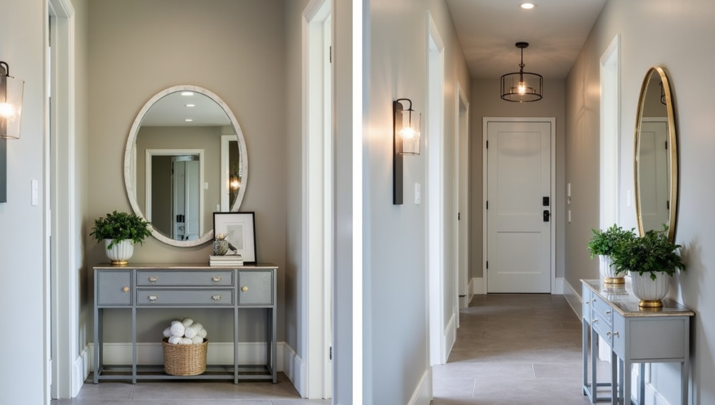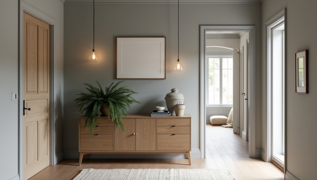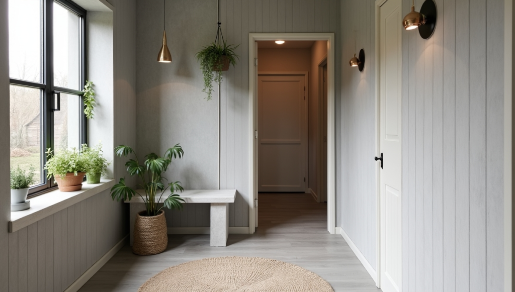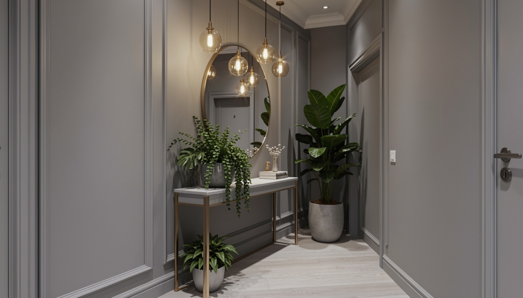 Lush greenery atop the table introduces life and freshness, contrasting gently with the muted palette. Pendant lights cast a cozy glow, enhancing the hallway’s welcoming feel. Carefully placed decorative objects, like small vases or framed prints, add personality without cluttering the space. This hallway demonstrates how combining natural elements with gray tones can create a serene and stylish passageway.