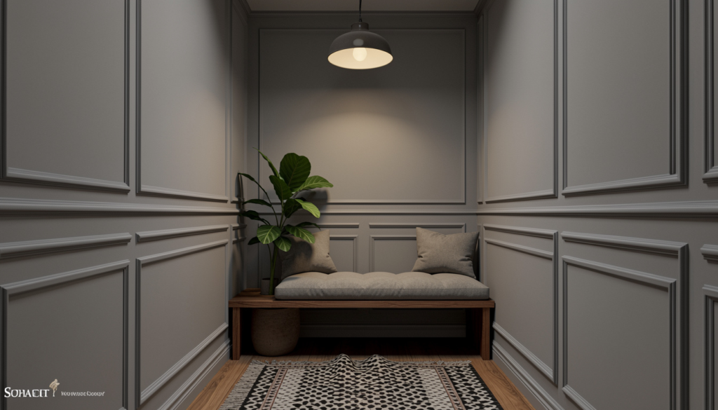This hallway corner blends muted gray tones with subtle architectural details, like wainscoting, to elevate the design. A plush cushion atop a wooden bench offers a quiet place to rest, while greenery brings life and freshness to the space.