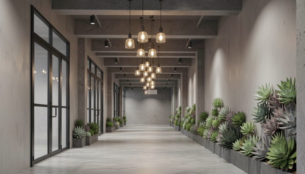 Greenery strategically placed along the passage interrupts the industrial motif, adding freshness and life. Pendant lights hang in symmetry, providing focused illumination while offsetting the stark concrete. This combination of industrial materials, soft lighting, and natural accents demonstrates how gray can serve as a stylish backdrop for contemporary, functional spaces.