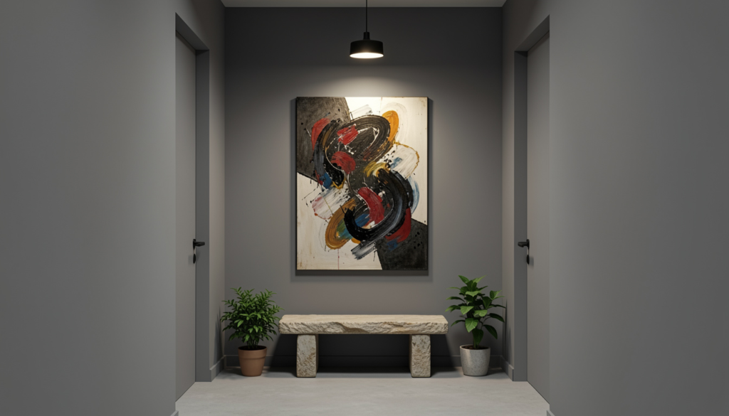 A striking abstract painting becomes the focal point in this minimalist gray hallway. The muted walls enhance the artwork’s impact, while a weathered stone bench below offers both seating and visual grounding.