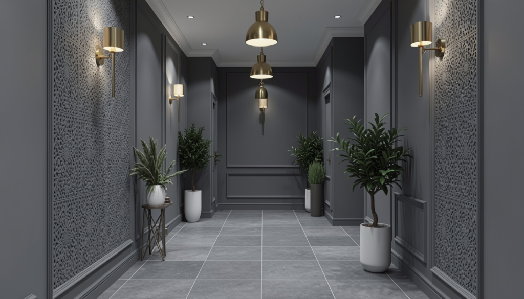 Decorative greenery injects vibrancy, while golden light fixtures bathe the space in warmth. The subtle interplay of light and shadow emphasizes texture and depth, making the hallway feel grand without overwhelming. This design proves how layered gray tones can create a regal, inviting corridor that celebrates understated luxury.