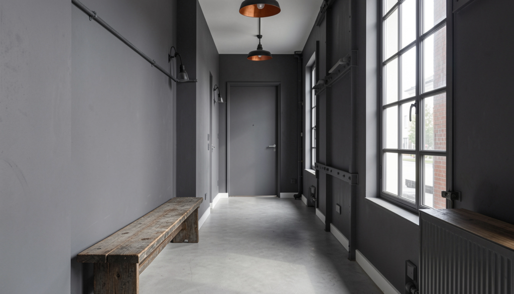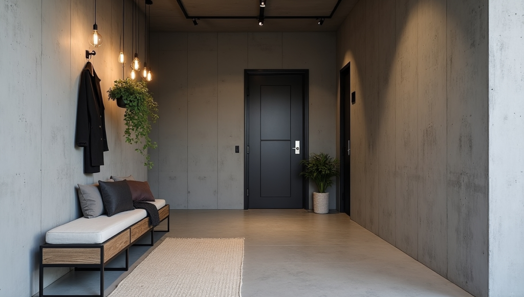 Concrete or slate-gray walls set the stage for a minimalist-industrial hallway. Clean lines, exposed materials, and functional furniture create a modern, utilitarian aesthetic without feeling harsh.