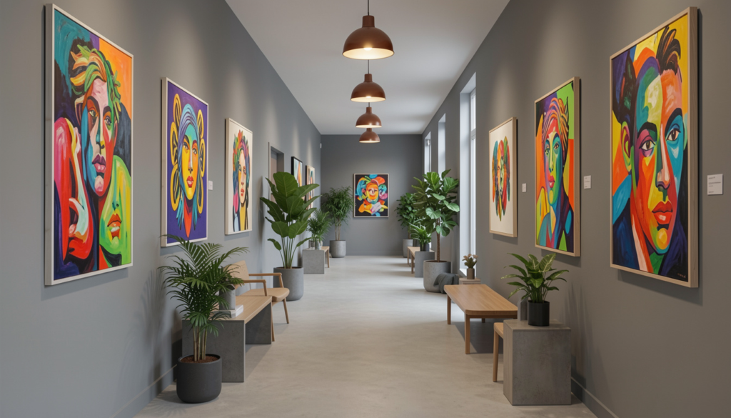 Green plants provide a natural complement, while daylight highlights both the clean lines of the architecture and the vibrancy of the art. Warm pendant lighting enhances textures and colors, transforming the corridor into an intimate gallery. This design illustrates how gray can support bold accents while maintaining a serene, welcoming passageway.