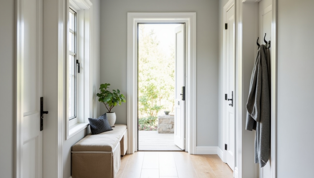 Inspired by Scandinavian design, this hallway emphasizes light, simplicity, and functionality. Soft gray walls paired with white trim create a clean, airy feel, while a narrow bench provides a practical seating area.