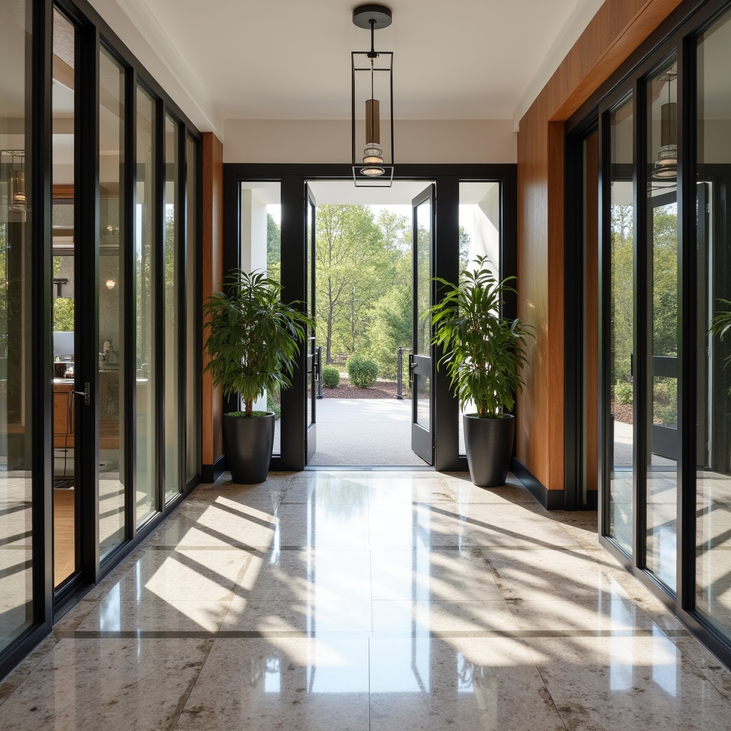 Step into a hallway where modern and classic design meet effortlessly. Checkerboard marble flooring anchors the space with timeless sophistication, while black-framed glass partitions catch sunlight, casting shifting reflections throughout the day. Warm wood tones and touches of greenery soften the crisp geometric lines, creating a balance between formality and livability.