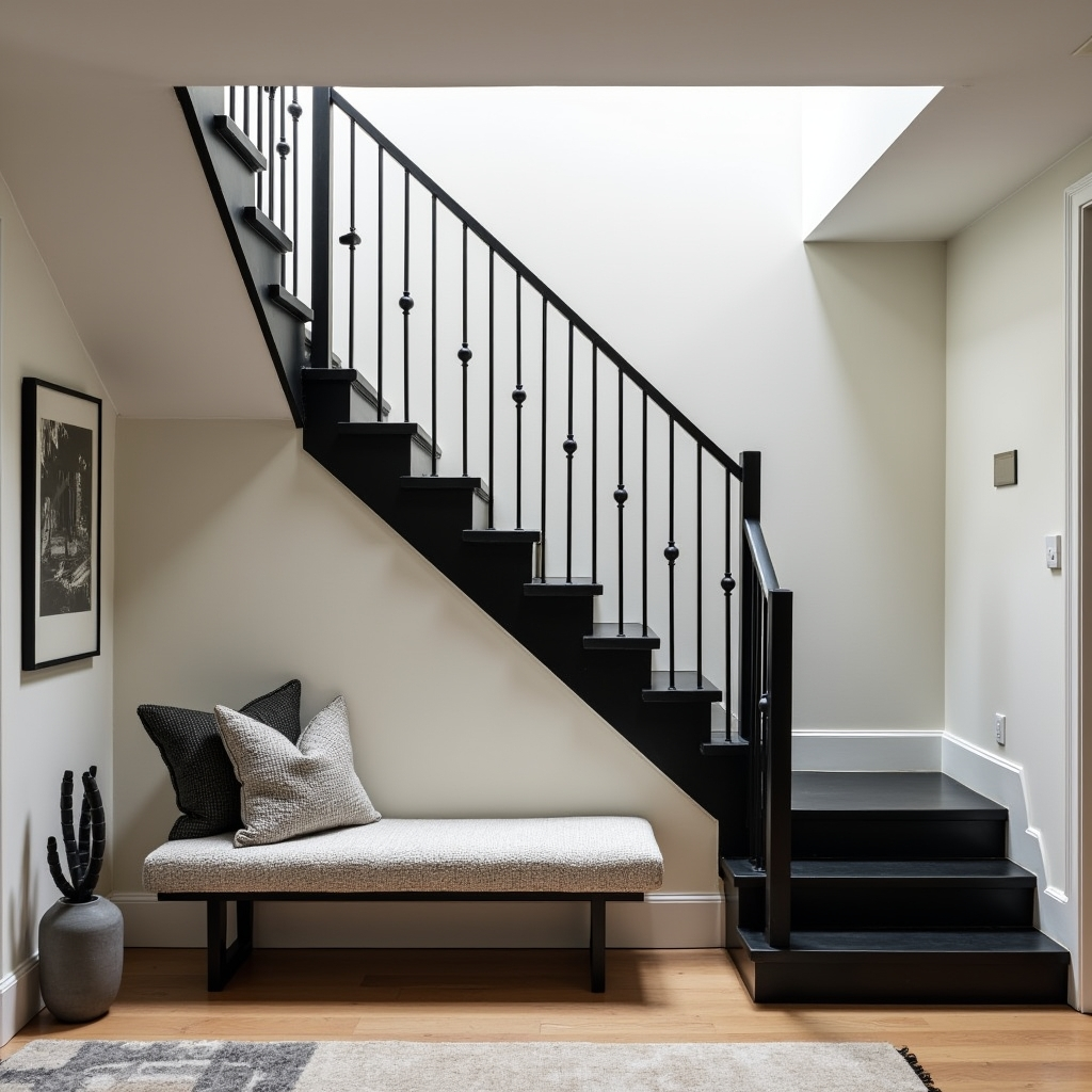Black-and-white design shines in this sleek stairwell, where a dark staircase rises dramatically against ivory walls. A boucle bench rests below, offering a cozy pause before ascending. Sculptural accents and carefully placed artwork add character, transforming the space from functional to memorable.