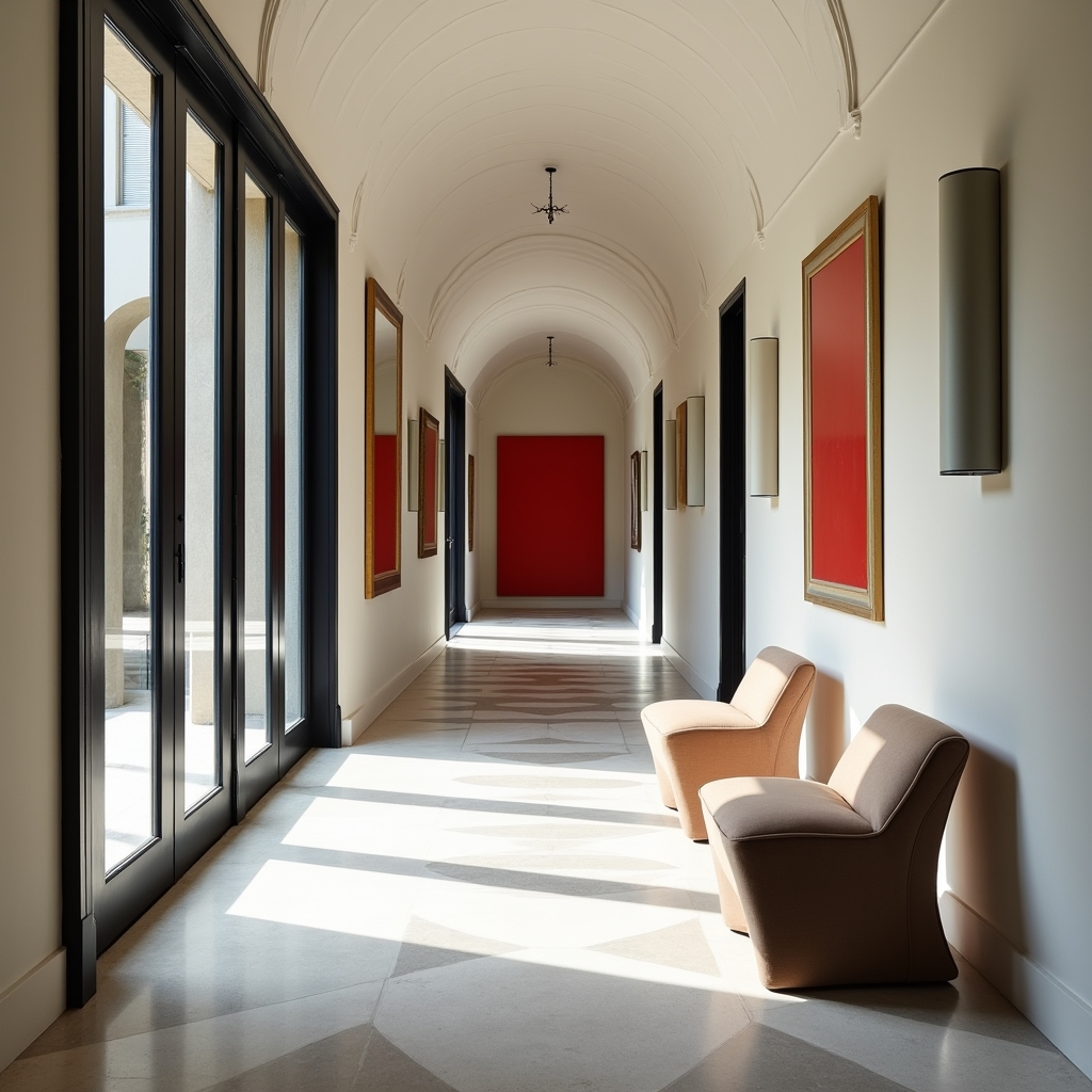 This hallway feels like walking through a living art gallery. Natural light streams through tall black-framed doors, illuminating sculptural chairs, geometric flooring, and a striking barrel ceiling. Minimalist wall sconces trace a rhythmic pattern, leading the eye toward a bold red portrait that anchors the end of the corridor.