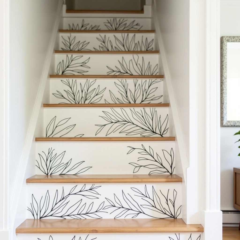 Every riser in this staircase doubles as an artwork, featuring delicate black foliage designs against crisp white surfaces. Honeyed wooden edges catch natural light, enhancing the artistry, while nearby minimalist furniture keeps the space uncluttered so the stairs remain the visual focal point.