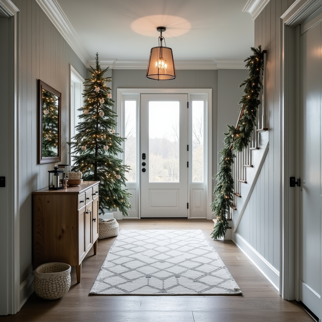 This Nordic-inspired hallway exudes understated holiday charm. Frosted grays, pale wood tones, and a snow-dusted tree create a serene seasonal scene. Every element, from the geometric rug to a softly draped garland on the staircase, evokes warmth and quiet elegance.