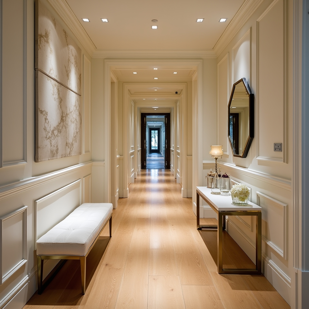 Polished wood floors, wainscoted walls, and plush seating create a corridor with subtle luxury. Metallic accents catch the soft glow of ceiling lights, while glass décor adds shifting reflections that animate the space as you move. The hallway feels hotel-luxurious yet approachable.