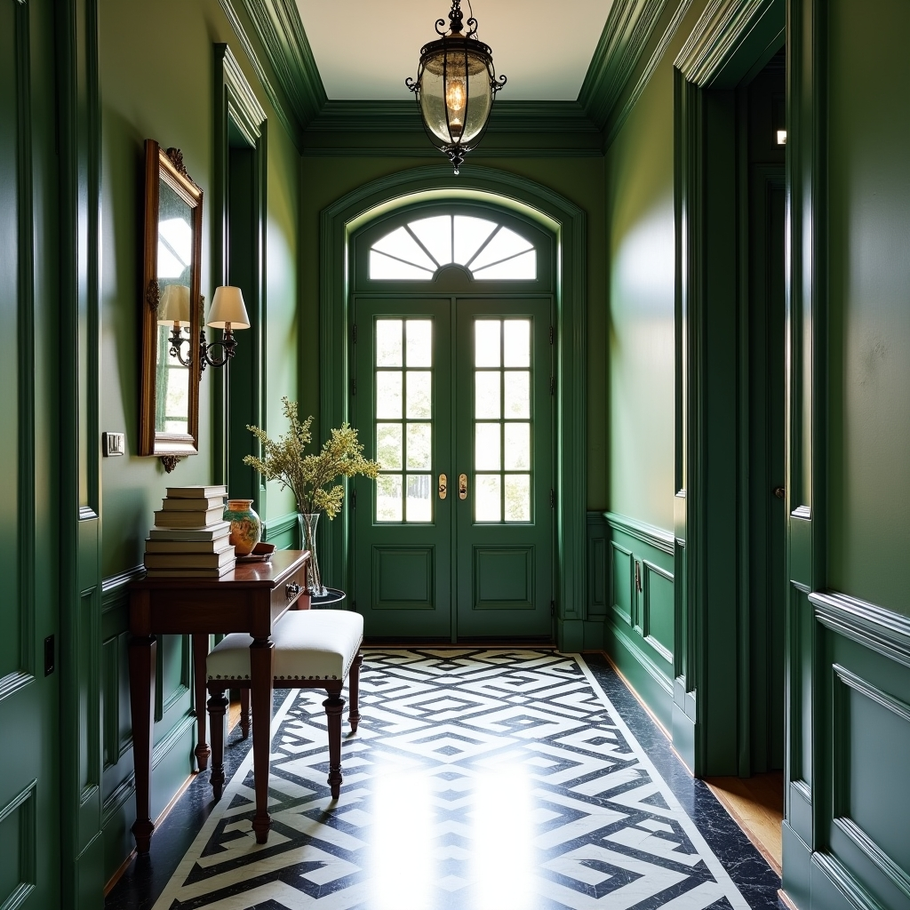 Step back in time with this Edwardian-inspired entryway, where intricate moldings and graceful arches speak of historical craftsmanship. Deep green wainscoting adds weight and dignity, while black-and-white marble tiles create rhythmic visual movement underfoot. The hallway feels both storied and approachable.