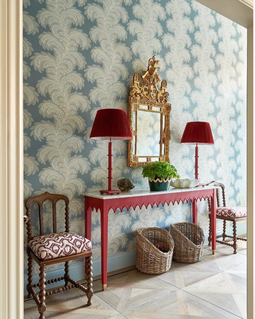 This hallway delights with theatrical style and refined playfulness. Powder-blue wallpaper with oversized palm motifs forms a striking backdrop for crimson lamps, scalloped consoles, and an ornate gold mirror. The mix of textures, patterns, and color produces a lively yet elegant environment.