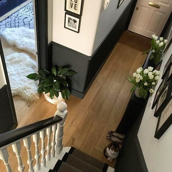 In this small hallway, contrasts create a sense of depth and style. Charcoal walls, crisp white trim, and blonde wood floors visually expand the space, while framed black-and-white photography adds cohesion. Potted plants introduce freshness and life, softening the monochrome palette.