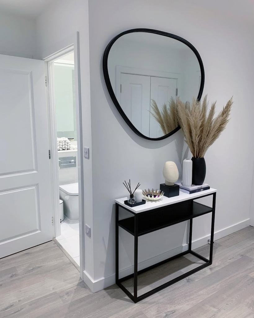 A curved black mirror, sleek console, and whisper of pampas grass create a serene, minimalist entryway. Muted tones and thoughtful design balance elegance with tranquility, providing a sense of calm without feeling cold or sparse.