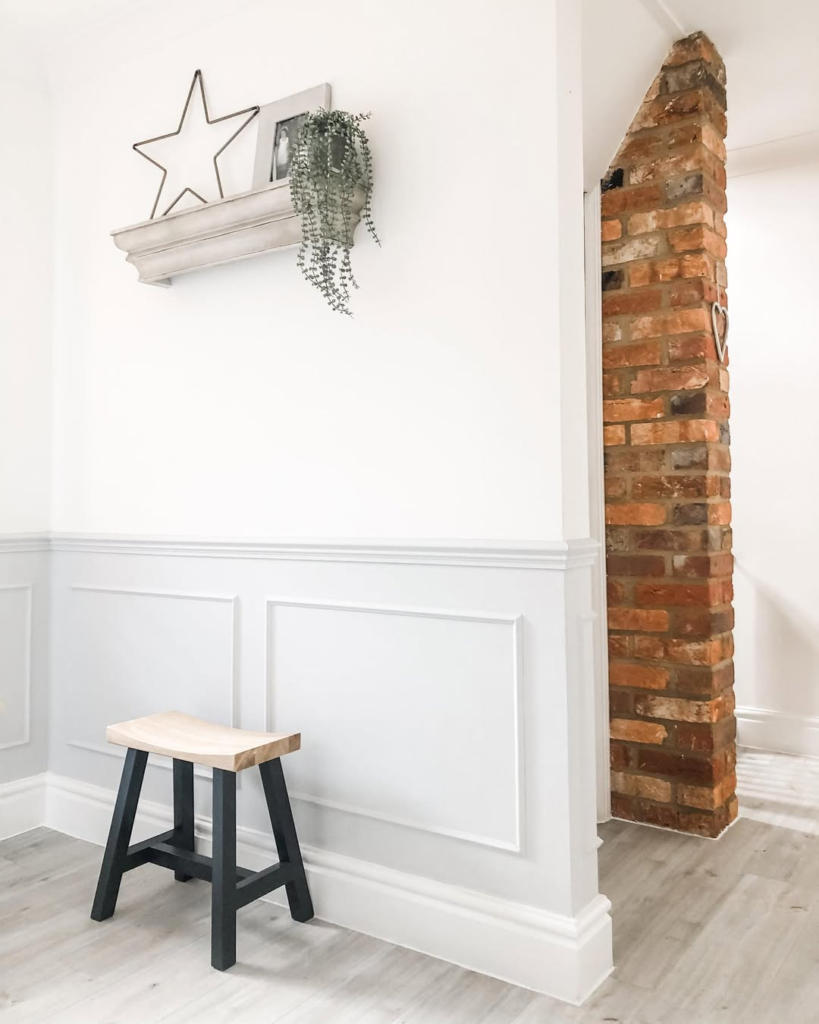 Soft gray wainscoting paired with whitewashed walls evokes quiet serenity. Bare wood elements and exposed brick lend warmth and texture, while subtle accents like framed stars and hanging greenery enhance the atmosphere. The space feels nostalgic, grounded, and intimate.