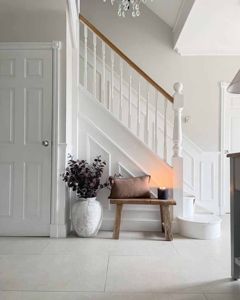 White-on-white simplicity comes to life with subtle texture and natural elements. Plaster walls, smooth paint, and stone floors combine to create a cool, elegant base, while rustic benches and vases with foliage introduce warmth and weight. The space blends minimalism with the charm of traditional farmhouse design.
