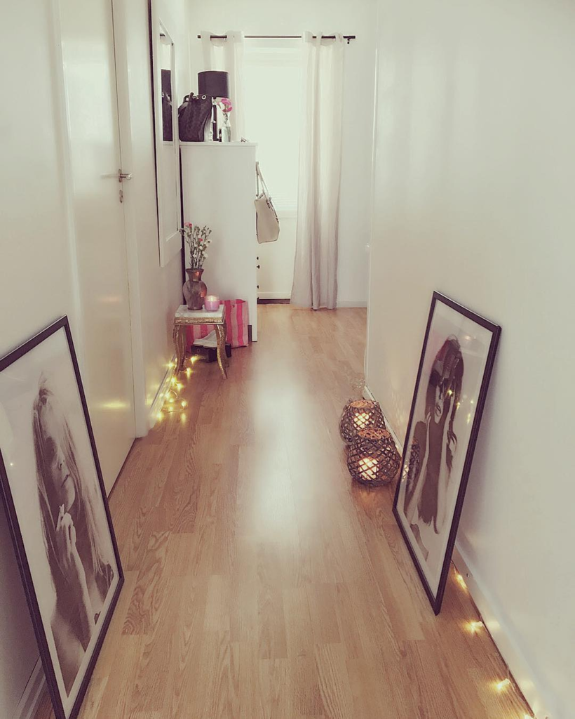 Soft pink-gold lanterns, fairy lights, and leaning portraits infuse this hallway with warmth and personality. Light transforms the wooden floors into honeyed tones, creating a nostalgic, dreamy atmosphere that feels cinematic and alive.