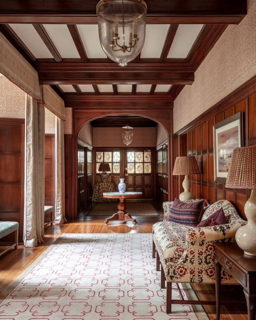 Stained wood panels, intricate rugs, and layered textiles create a hallway steeped in history and storytelling. Pendant lights cast pools of golden illumination, highlighting details that speak to centuries of craftsmanship. The space feels museum-worthy yet intimate, a tribute to refined tradition.