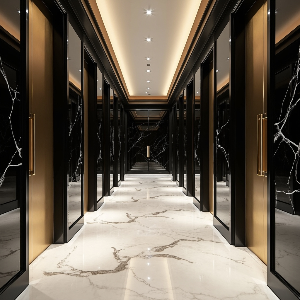 Polished marble floors and black-and-gold cabinetry create a hallway that exudes modern luxury. Symmetrical lines and reflective surfaces catch light, enhancing the space’s commanding presence. Metallic accents and statement lighting elevate the corridor, making every arrival feel dramatic and intentional.