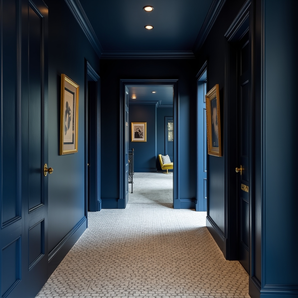 Navy walls, shadowed ceilings, and subtle gold accents transform this hallway into a sophisticated, moody retreat. Patterned floor tiles provide rhythm, while daylight streams softly, creating depth and highlighting textures. The result is refined, restrained elegance that feels intentional and lasting.