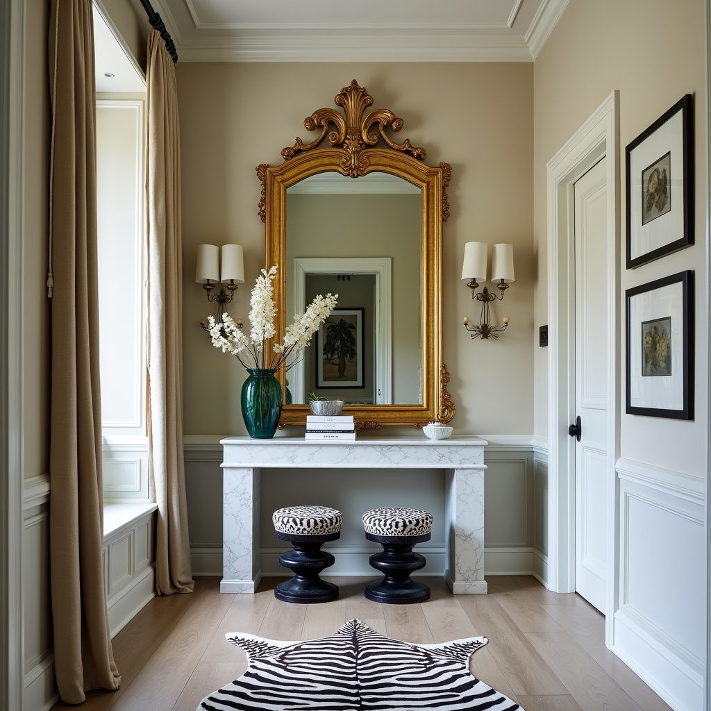 A towering gilt mirror, marble console, and sculpted stools blend old-world opulence with modern sensibility. Zebra-hide accents and metallic details add dynamic contrast, ensuring the space breathes luxury without arrogance.