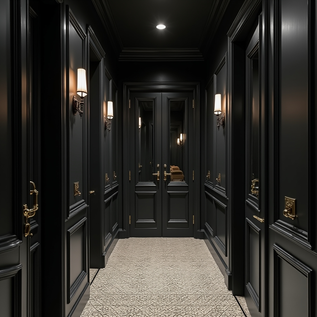 Use rich tones, mirrors, and structured lighting to capture noir elegance. This approach transforms a transitional space into a cinematic corridor, blending historic reference with contemporary refinement, and ensuring that every step through the hallway feels intentional and evocative.