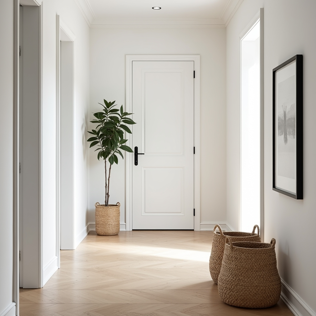 This Scandinavian-inspired hallway emphasizes serenity through simplicity. White walls, natural timber floors, and woven baskets highlight functional beauty and mindful design. Every element is deliberate yet effortless, creating a space that feels calm, luminous, and grounded.