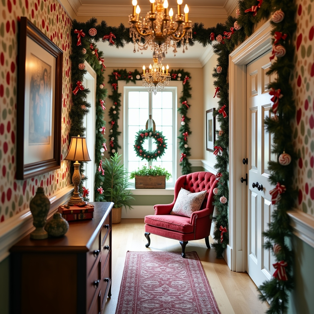 Twinkling garlands, peppermint-striped ornaments, and velvet ribbons bring storybook Christmas magic to this hallway. A button-tufted chair and gingerbread accents enhance the nostalgic ambiance, creating a warm, playful, and festive atmosphere that invites lingering and joy.