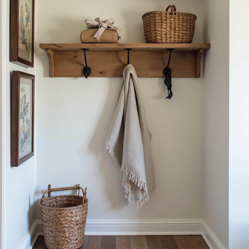 Raw wood, black hooks, and handmade portraits create a space that celebrates craftsmanship and authenticity. Timber, metal, and linen blend harmoniously, delivering understated style with rustic charm. The hallway feels familiar, grounded, and effortlessly stylish.