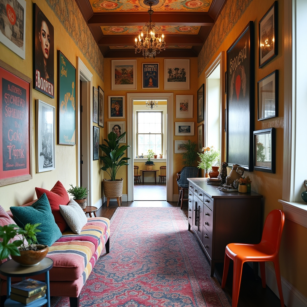 Emphasize mood over symmetry with layered lighting and lived-in art. The combination of natural materials, warm tones, and eclectic décor ensures that even a narrow passageway can evoke creativity, comfort, and an effortlessly bohemian charm that feels personal and expressive.
