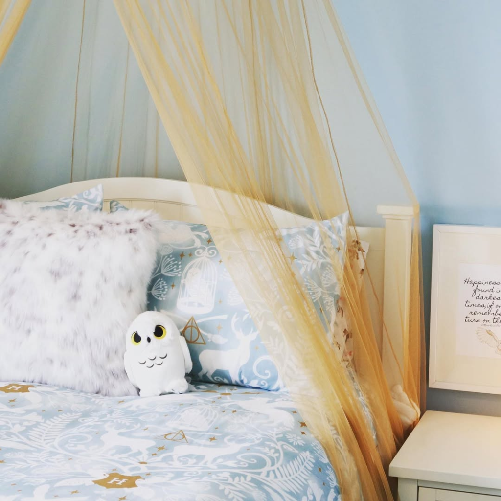 This bedroom evokes magic in a subtle, inviting way. Soft blue bedding sprinkled with understated wizarding symbols creates a dreamy atmosphere, while a golden canopy drapes gently over the bed like it was lifted straight from Hogwarts. Small touches, like a Hedwig plush perched on the pillow, bring the theme together without overwhelming the space. The overall effect is cozy, whimsical, and comfortable—perfect for a young witch or wizard winding down after a day of imaginary spells and enchanting adventures.